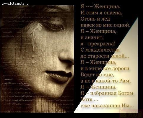| Я женщина. а значит, я всесильна...... http://www.youtube.com/watch?v=IjmHeaYJ0lk&feature=related Я - Женщина, и, значит, я - Актриса, Во мне сто лиц и тысяча ролей. Я - Женщина, и, значит, я - Царица, Возлюбленная всех земных царей. Я - Женщина, и, значит, я - Рабыня, Познавшая соленый вкус обид. Я - Женщина, и, значит, я - Пустыня, Которая тебя испепелит. Я - Женщина. Сильна я поневоле. Но знаешь, даже если жизнь - борьба, Я - Женщина, я слабая до боли. Я - Женщина, и, значит, я - Судьба. Я - Женщина. Я - просто вспышка страсти, Но мой удел - терпение и труд. Я - Женщина. Я- то большое счастье, Которое совсем не берегут. Я - Женщина. И этим я опасна. Огонь и лед навек во мне одной. Я - Женщина, и, значит, я - Прекрасна С младенчества до старости седой. Я - Женщина, и в мире все дороги Ведут ко мне, а не в какой-то Рим. Я - Женщина, я избранная Богом, Хотя уже наказанная им… http://www.youtube.com/watch?v=NH1iiXqY160&feature=related